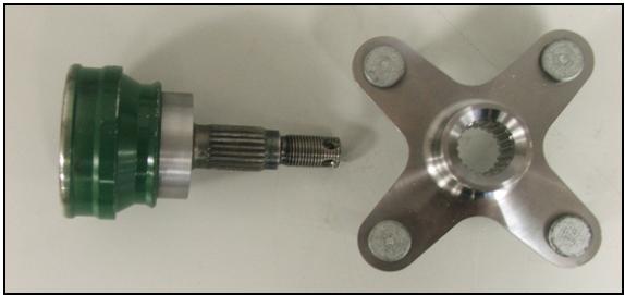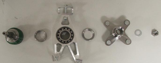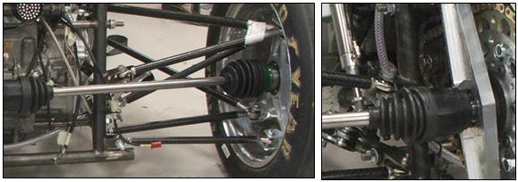 Constant velocity (CV) joints have been used to isolate the differential from suspension travel. These come from the front transmission of a Honda Fourtrax Foreman 550 cc all terrain vehicle and were chosen on account of their lightweight design and simple interface with the differential.