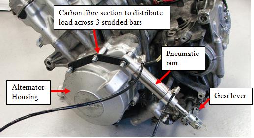 A pneumatic semi-automatic system is employed in the 2009 Surrey vehicle. The 2008 vehicle has a manual system and this was benchmarked to provide a clutch-less gear change time of 200 ms. The new system should be capable of performing a gear change in 50 ms. The driver controls the gear changes with paddles mounted on the steering wheel. The system uses a compressor powered from the battery. This is mounted at the front of the vehicle and the hose is extended to the rear where the ram is mounted to the engine and gear lever arm. This allows a sufficient volume of air to be stored in the hose without the need for a reservoir. It is capable of multiple gear changes in a short amount of time and this actuation time can be adjusted.