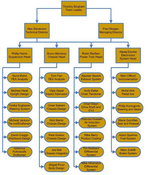 At the peak of the tree is the Team Leader, Timothy Bingham, who was responsible for the whole project and took many decisions as overall leader of the team. The Managing Director, Paul Morgan aided with team
